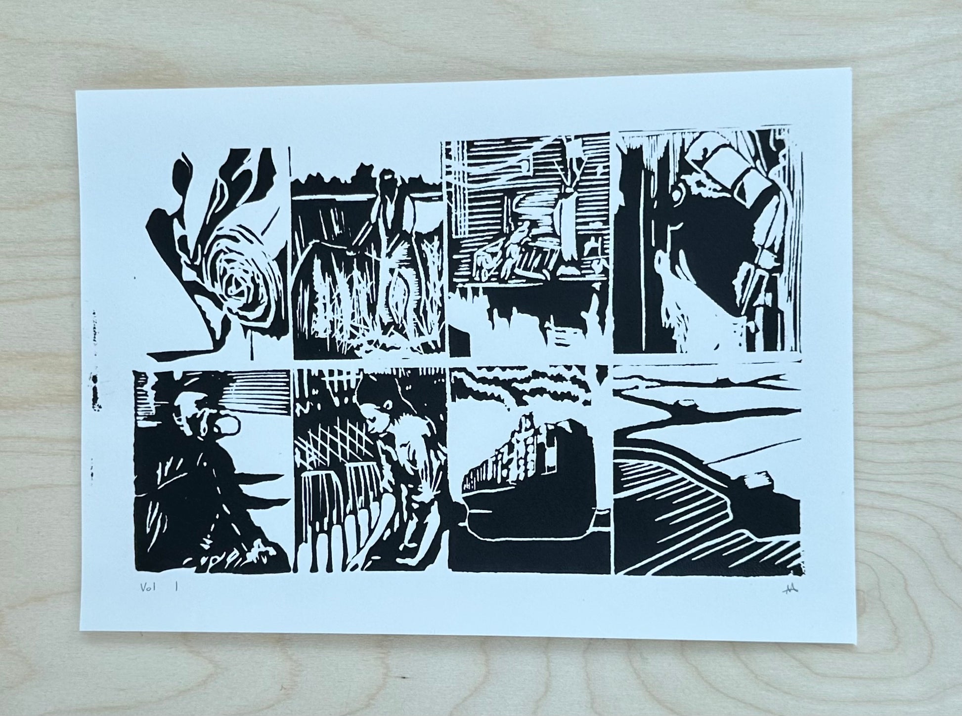 Hand-carved and screen-printed on 9x12" paper. Each square is my remediated version of each individual section of Capital Volume 1.