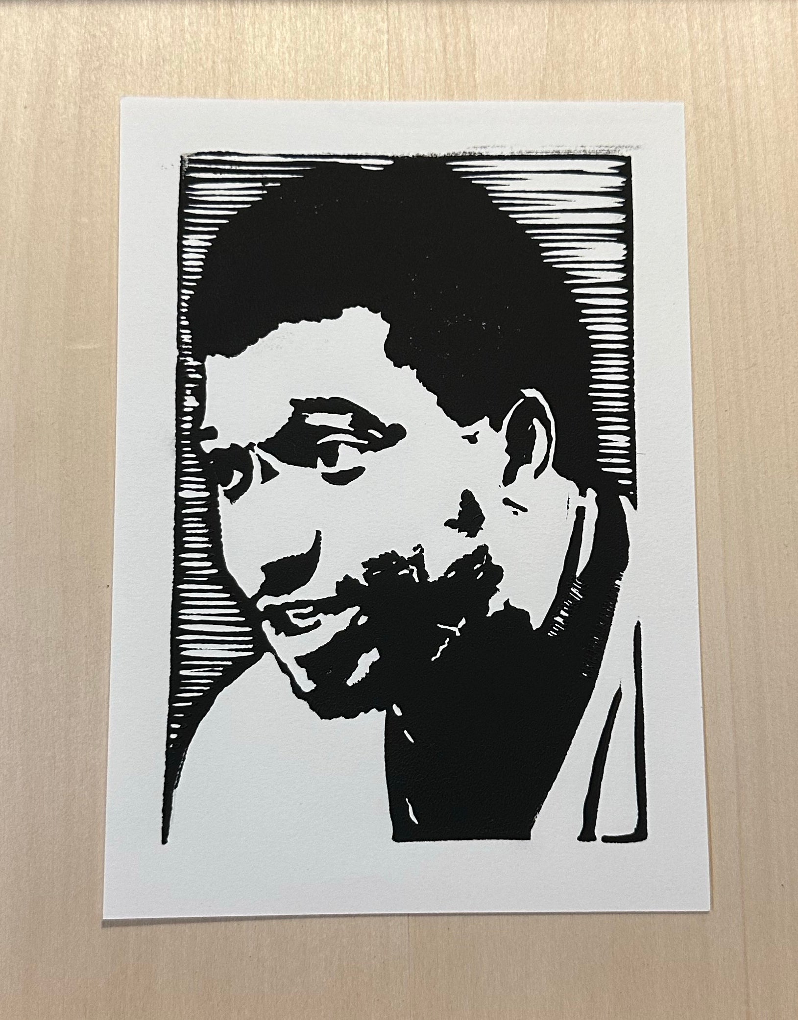 Hand carved on 4x6" block and printed on 5x7" paper.
