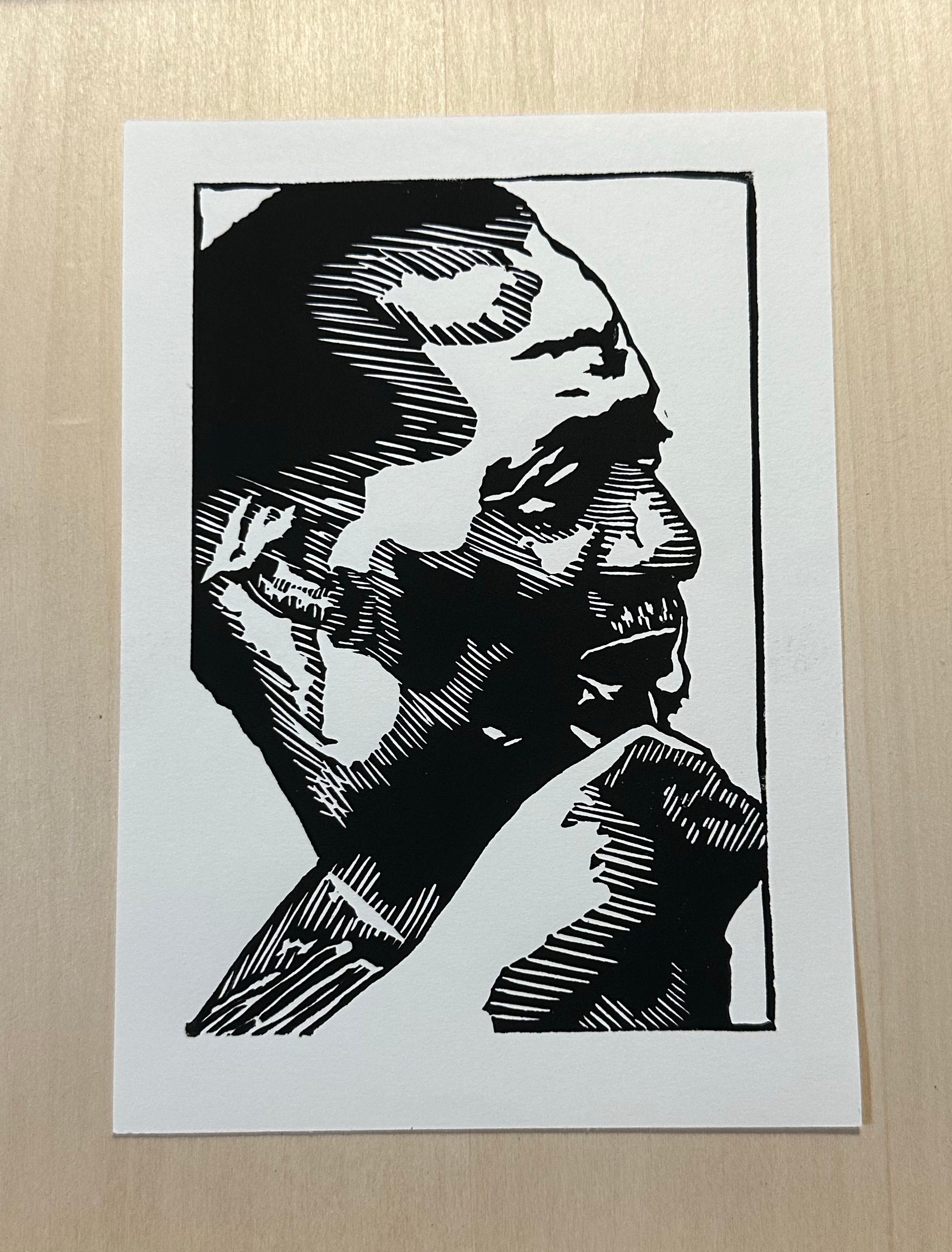 Hand carved on 4x6" block and printed on 5x7" paper.