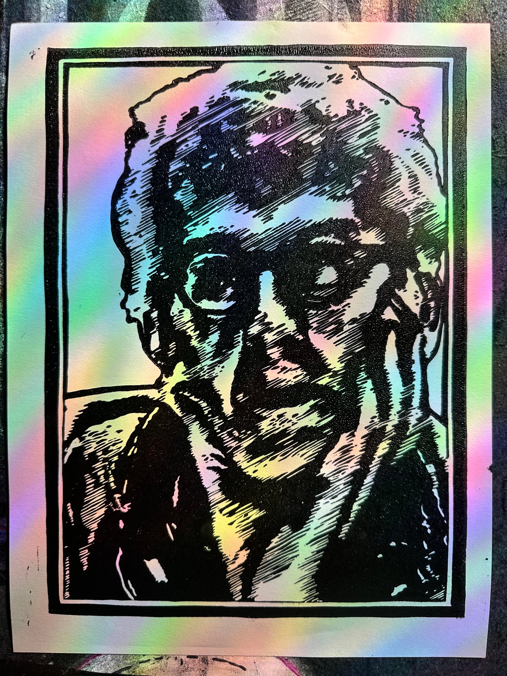 Hand carved and printed on 9x12" paper. Rainbows not included.