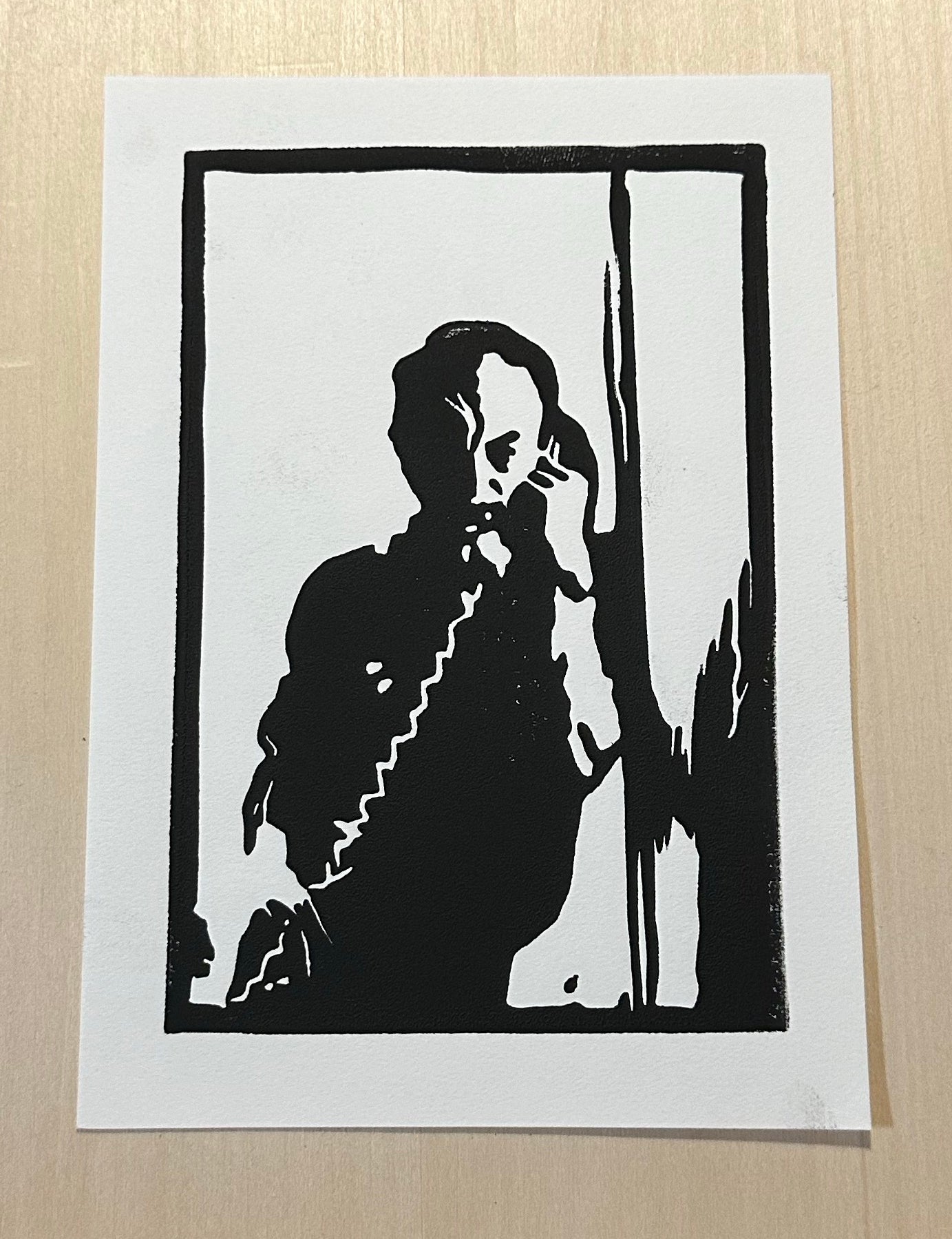 Hand carved on 4x6" block and printed on 5x7" paper.