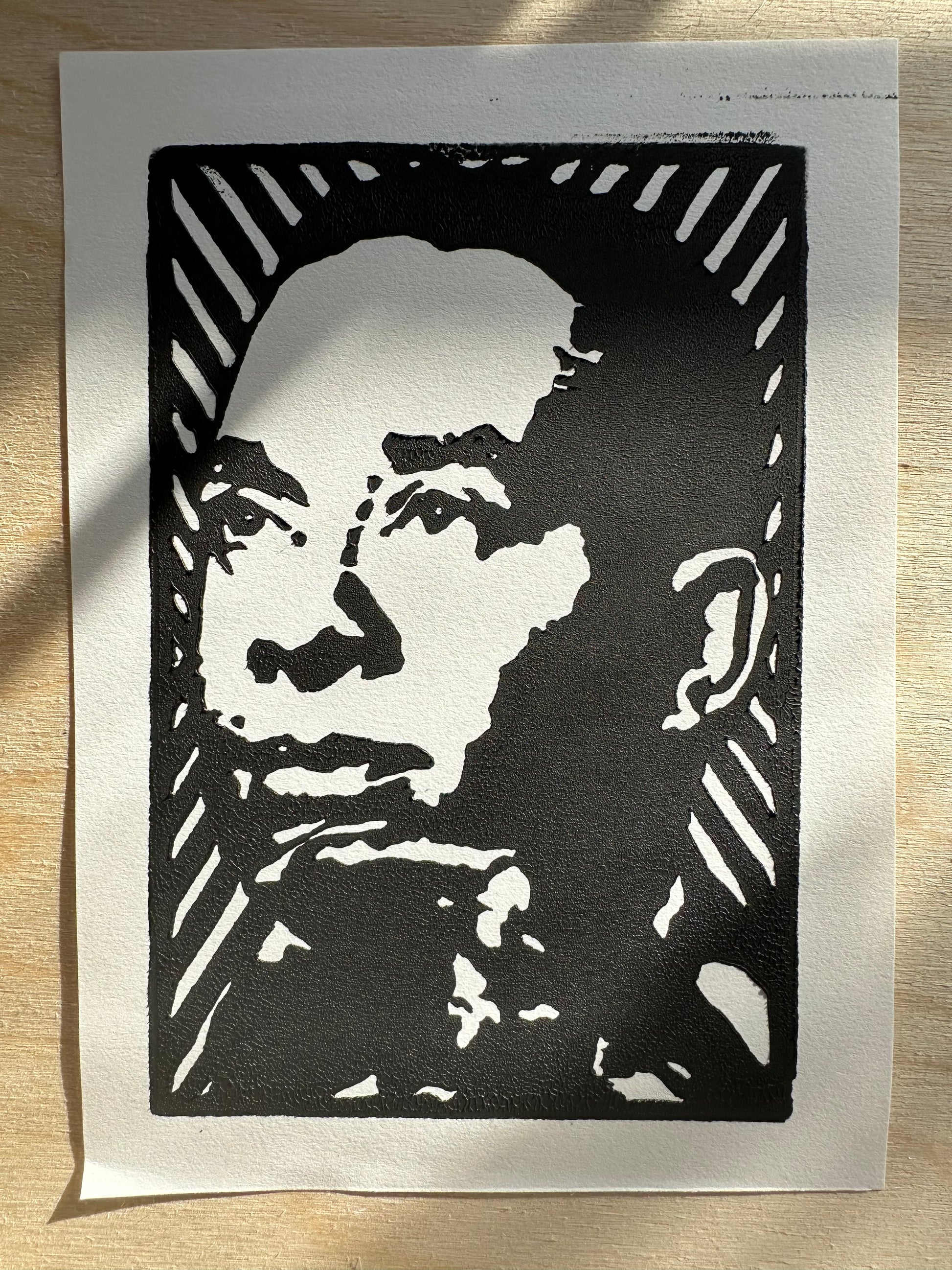 Hand carved on 4x6" block and printed on 5x7" paper.