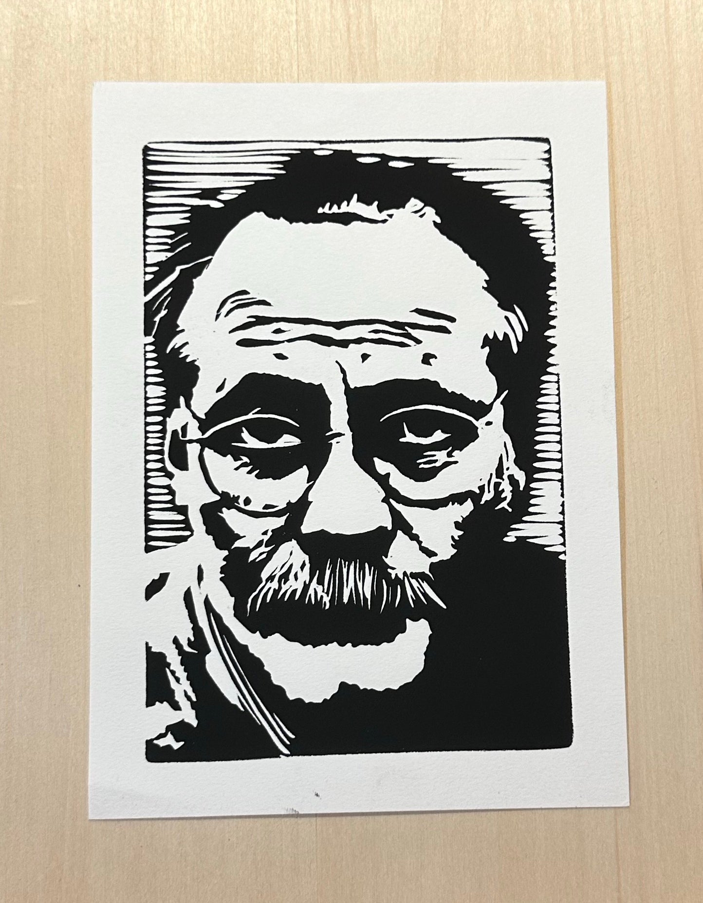 Hand carved on 4x6" block and printed on 5x7" paper.