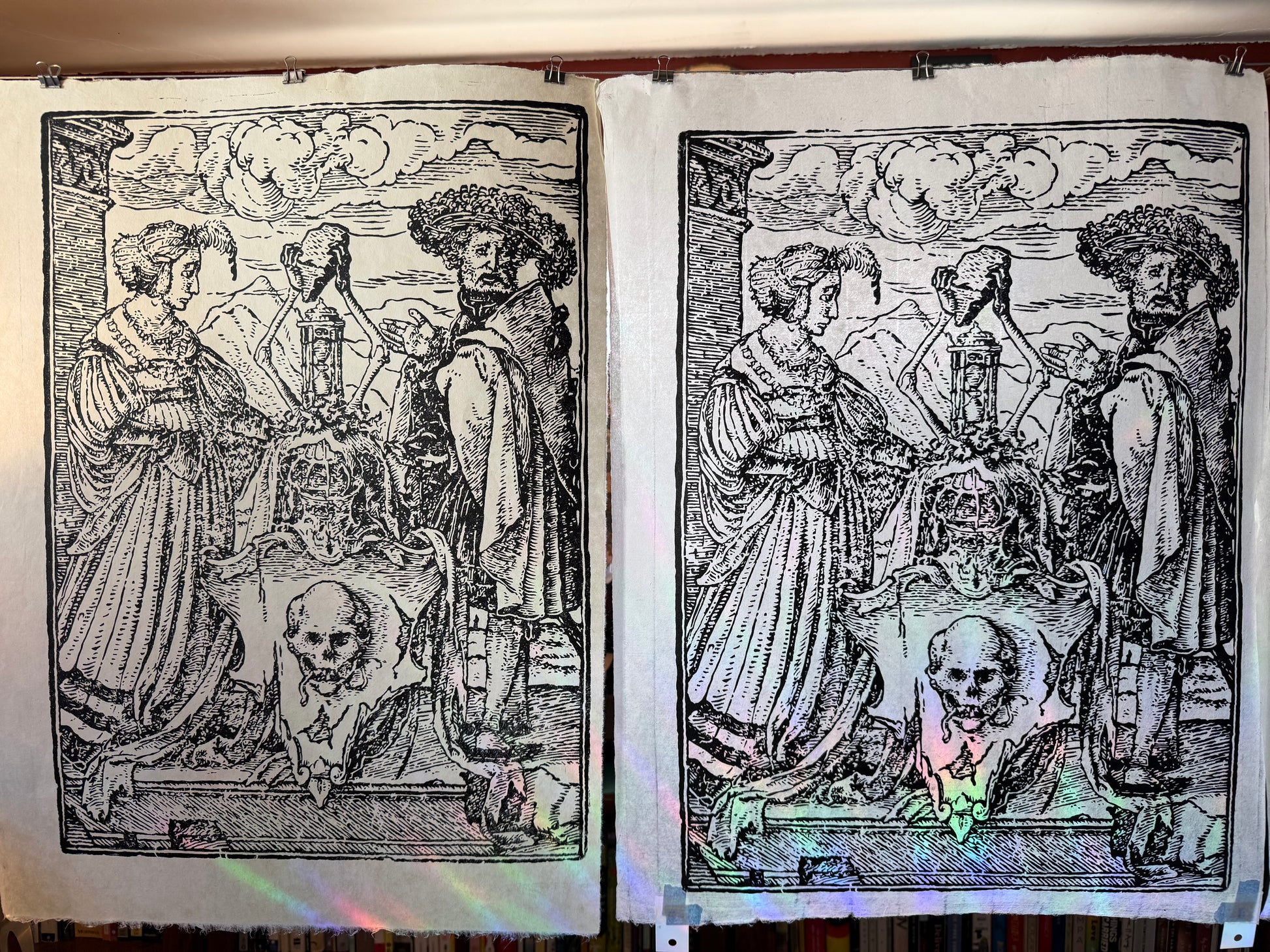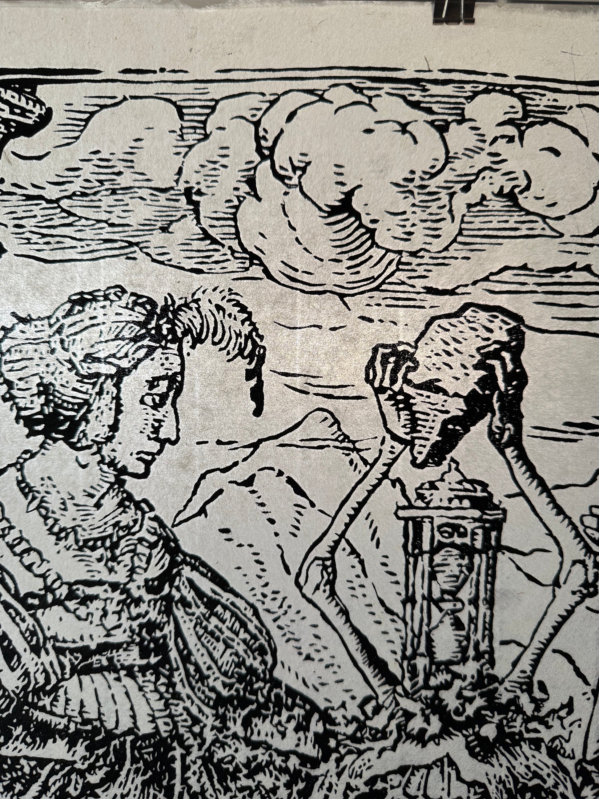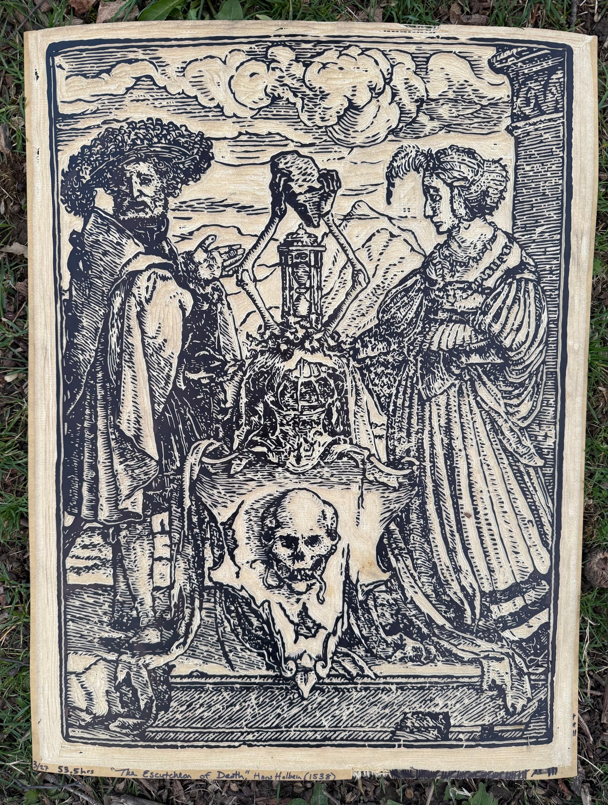 Newly carved remake of Hans Holbein's "The Escutcheon of Death" 1538.