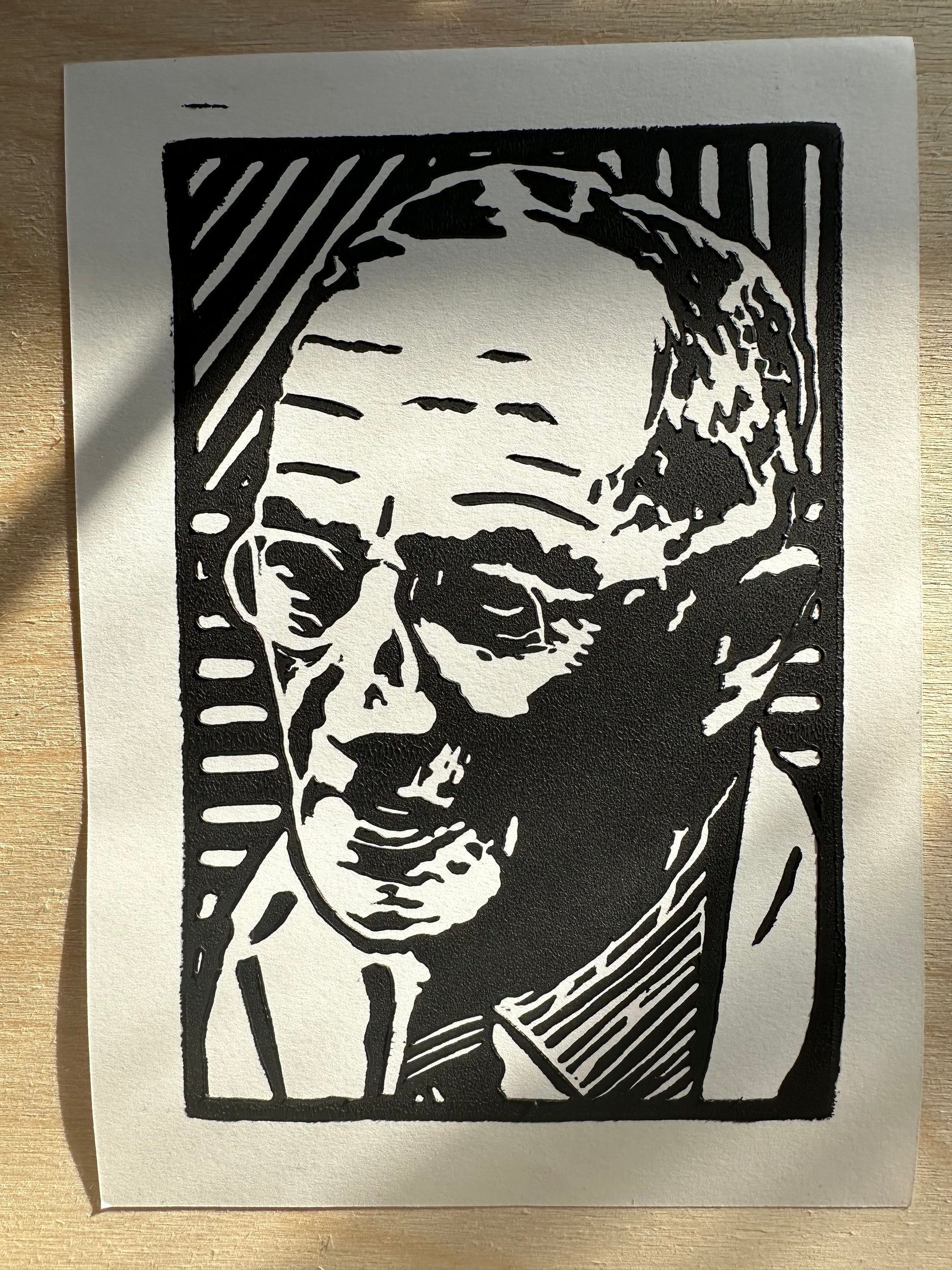 Hand carved on 4x6" block and printed on 5x7" paper.